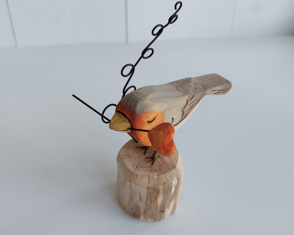Une décoration rouge-gorge sculpté en bois.