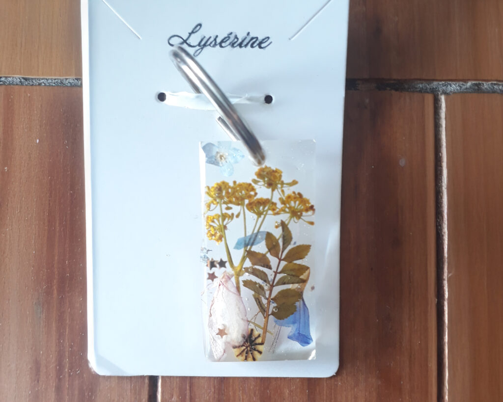 Un porte-clé en résine et fleurs.