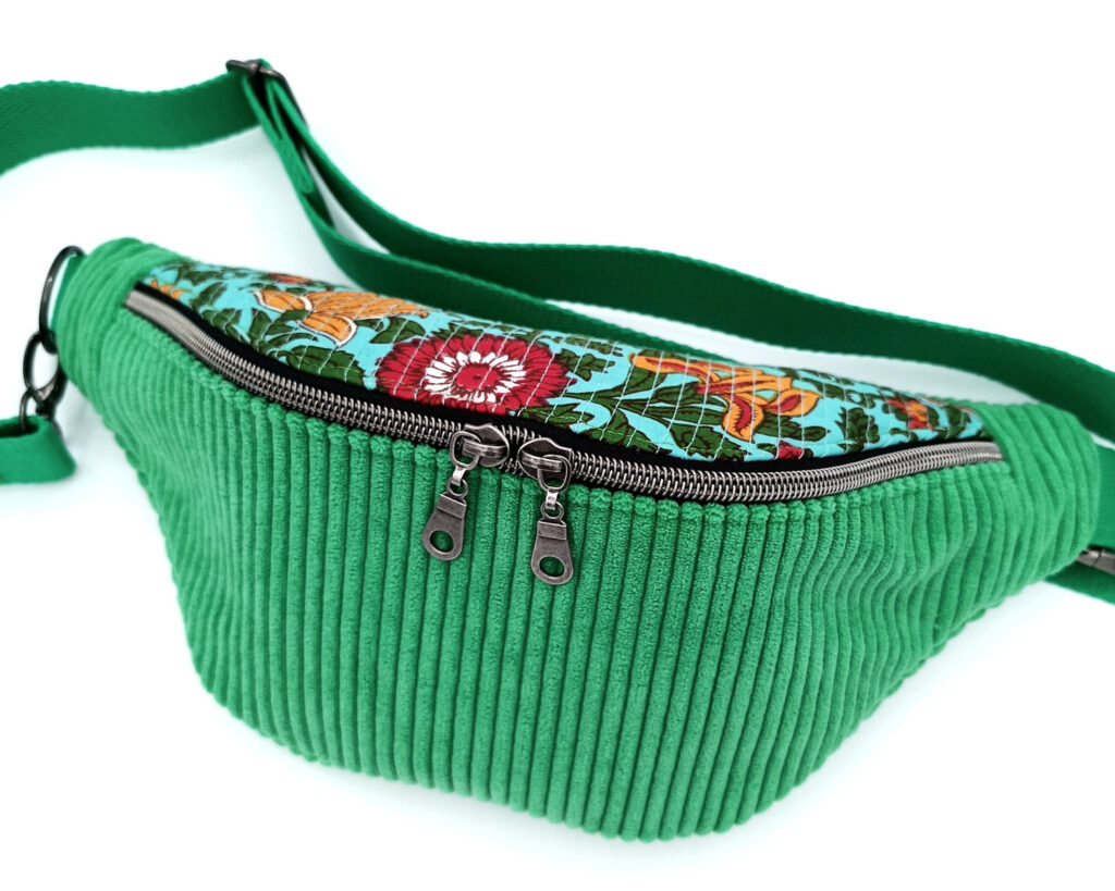 Un sac banane bicolore en velours côtelé.