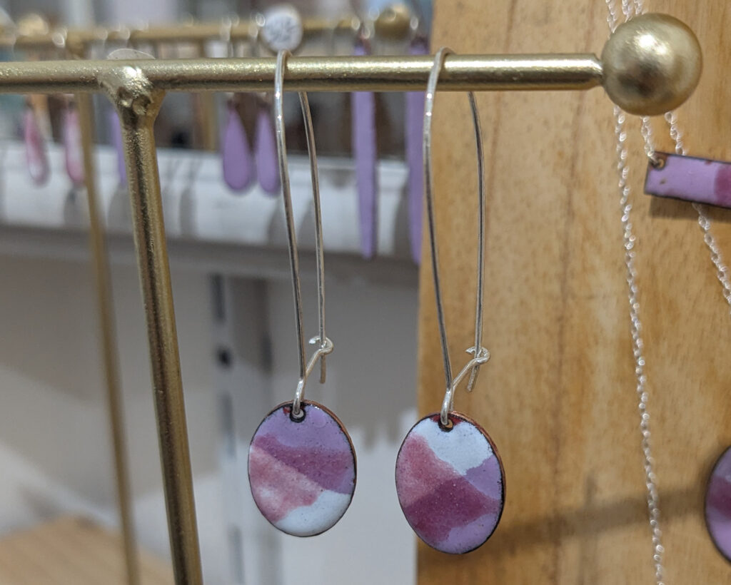 Une paire de boucles d’oreille en émail sur cuivre, crochets en argent massif 925.