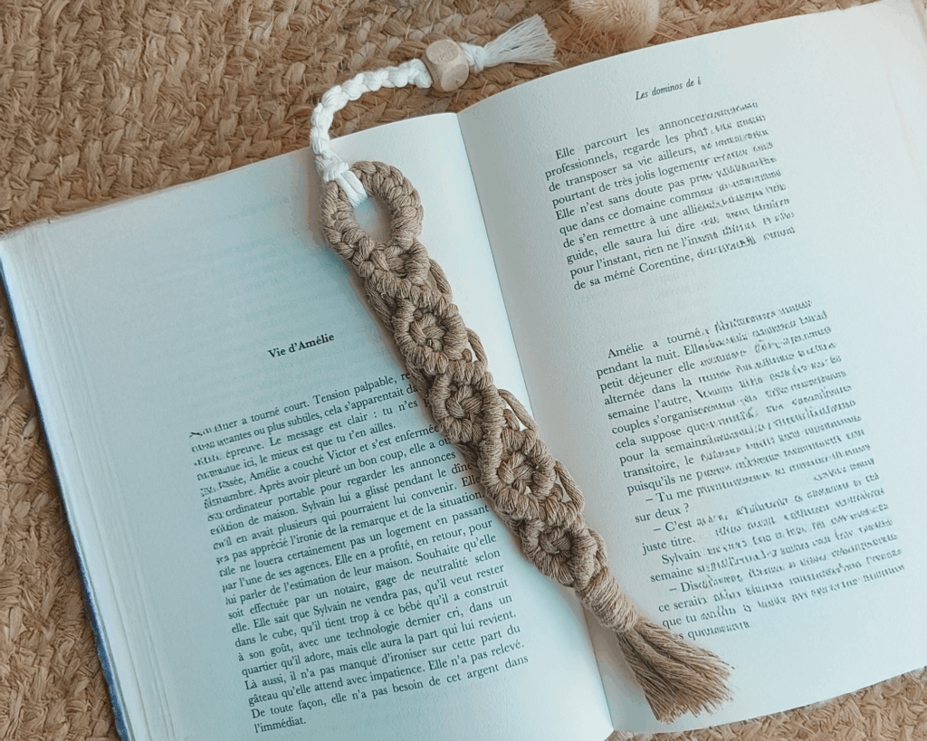 Un marque-page en macramé marron.