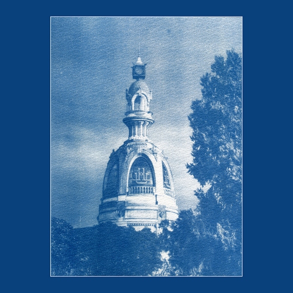 Fan de photo ancienne, je développe mes propres clichés et photomontages selon une méthode artisanale datant de 1842, le cyanotype. Il s’agit d’établir un contact entre un négatif et une surface enduite d’une solution photosensible, puis le développement se fait grâce aux rayons ultraviolets du soleil ou d’une lampe. Enfin, la révélation se fait par rinçage à l’eau claire. La photo devient monochrome, mais bleue !