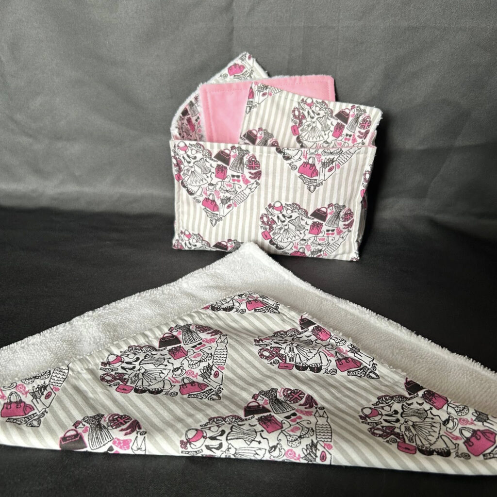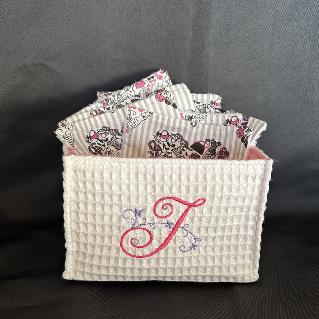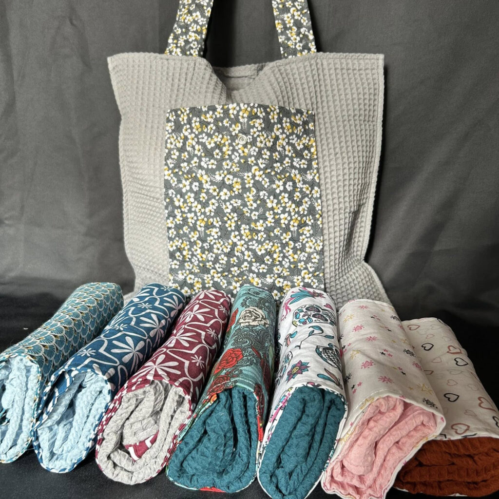 Bonjour, Je fais de la création couture (lingettes, panière, pochette, …) que je peux personnaliser à l’aide de ma brodeuse. Avec des initiales, texte, dessin …